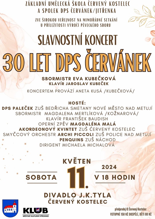 ZUŠ Červený Kostelec a DPS Červánek zvou širokou veřejnost na slavnostní koncert u příležitosti výročí pěveckého sboru.