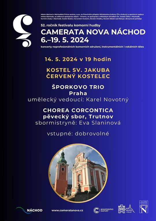 V úterý 14. května se v rámci festivalu uskuteční koncert také v kostele sv. Jakuba v Červeném Kostelci. Vystoupí Šporkovo trio Praha a Chorea Concortica z Trutnova.
