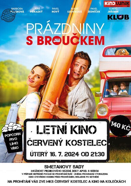 Městské kulturní středisko a kino Luník ve spolupráci se společností KINO NA KOLEČKÁCH promítnou českou komedii Prázdniny s Broučkem. Kdo by někdy nechtěl vyrazit na rodinnou dovolenou krásným červeným karavanem po dědovi? Bára Poláková coby dobrodružná máma dvou dětí a nadšená food blogerka, řekne této výzvě ano. Její manžel, kterého si zahrál Lukáš Příkazký, dobrodružné nadšení ani trochu nesdílí. Ale když máme vedle sebe někoho, koho máme rádi, je úplně jedno, kde zrovna jsme. Celá rodina proto nakonec vyrazí na letní dovolenou k moři obytňákem. A přesto, že je Jadran doslova na dosah, cesta se může pořádně protáhnout. Promítání proběhne ve Smetanových sadech v úterý 16. července od 21:30 hodin (po setmění) a vstup bude možný hodinu před promítáním. Vstupné 140 Kč. Drobné občerstvení zajištěno, deky či sezení s sebou.