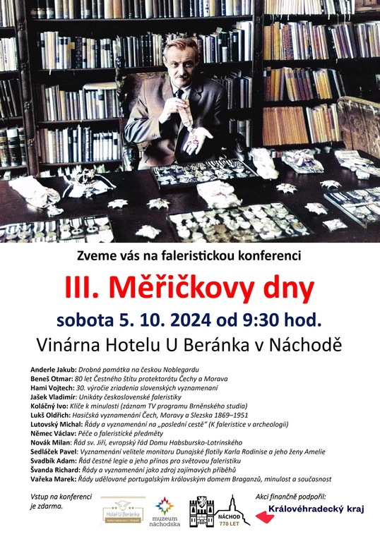 V předchozích letech proběhly v Náchodě již dvě konference, jejichž ústředním tématem byly řády a vyznamenání a připomínka nejvýznamnějšího českého faleristy Václava Augusta Měřičky, českoskalického rodáka. V souvislosti s letošním výročním města Náchoda proběhne v říjnu další ročník, který nabídne zajímavé příspěvky od renomovaných českých a slovenských historiků a badatelů. Hlavní program se uskuteční ve vinárně Hotelu U Beránka v Náchodě v sobotu 5. října 2024 od 9:30 hod. Vstup po celou dobu konání akce zdarma. Doprovodným programem bude menší výstavka evropských řádů a vyznamenání v Muzeu Náchodska. Bližší informace naleznete na internetu a výlepových plochách. Akci podpořily: Město Náchod, Muzeum Náchodska, Hotel U Beránka a finančně Královéhradecký kraj. Mnohokrát děkujeme a těšíme se na návštěvu!