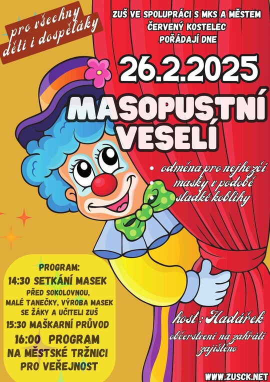Začínáme ve 14:30 na parkovišti u sokolovny, kde vás čekají společné tanečky a možnost vytvořit si masku s pomocí žáků a učitelů výtvarného oboru.