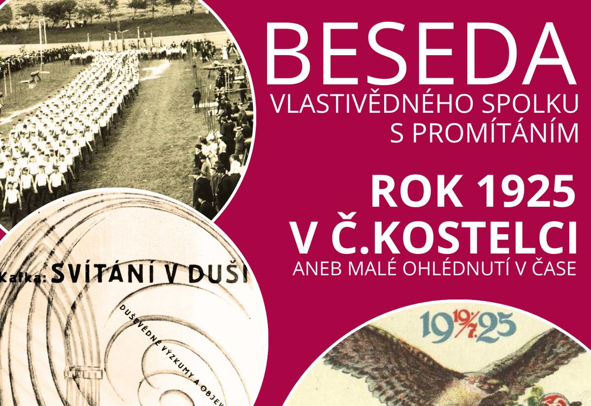 Jaký byl rok 1925 v Červeném Kostelci? Což, kdybyste měli možnost přenést se v čase o 100 let zpět a podívat se, jak to vypadalo před sto lety v našem městě? Na této besedě se vrátíme do minulosti a za pomocí fotografií, vzpomínek, novinových článků a dalších archivních zdrojů zjistíme, co se v našem městě odehrávalo v roce 1925.