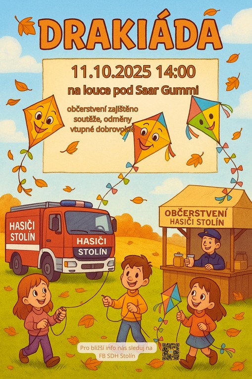 Sbor dobrovolných hasičů Stolín srdečně zve všechny děti i dospělé na Drakiádu, která se uskuteční v sobotu 11. října 2025 od 14:00 hodin na louce za bývalým kravínem a pod Saargummi.. Čeká vás odpoledne plné zábavy – soutěže, odměny pro děti a občerstvení, které zajišťují hasiči Stolín. Přijďte si užít podzimní atmosféru, vypustit draky a strávit hezký den s rodinou a přáteli. Vstupné je dobrovolné.
