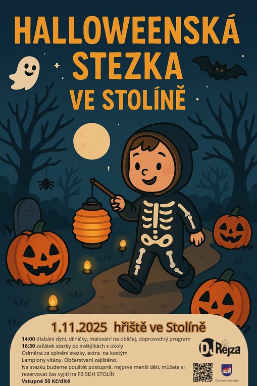 Od 14:00 tvořivé dílničky – vyřezávání dýní a výroba lampionů, během odpoledne a večera děti zabaví DJ Rejza. Připraveny jsou také různé hry a malování na obličej. V 16:30 odstartuje večerní stezka pro děti plná úkolů a odměn. Prosíme, aby si děti vzaly lampion (případně si jej mohou vyrobit na místě). Na trasu budou nejdříve vyrážet menší děti; z organizačních důvodů prosíme o rezervaci času vyjití předem přes Facebook SDH Stolín. Kostýmy vítány! Přijďte si užít podzimní atmosféru plnou světýlek, kostýmů a zábavy. Těšíme se na vás! Pořádá: SDH Stolín.
