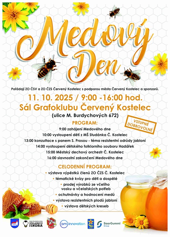 Medový den pořádají ZO ČSV a ZO ČZS Červený Kostelec s podporou města Červený Kostelec a sponzorů.