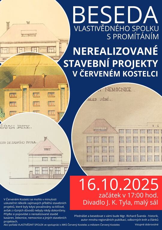 V Červeném Kostelci se mohlo v minulosti uskutečnit několik zajímavých příběhů stavebních projektů, které byly kdysi považovány za klíčové, avšak z různých důvodů nebyly nikdy dokončeny. Přijďte si popovídat o nerealizované stavbě kasáren, železnice, nemocnice a jiných stavebních projektech. Přednášet a besedovat s vámi bude Mgr. Richard Švanda – historik, autor mnoha regionálních publikací, odborných knih a článků.