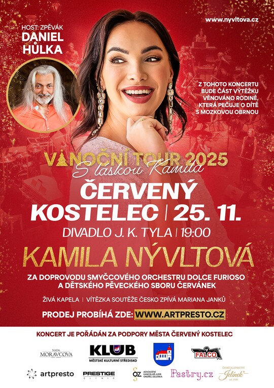 Přijměte pozvání na vánoční koncert Kamily Nývltové za doprovodu smyčcového orchestru Dolce furioso a DPS Červánek. Jako hosté vystoupí také Daniel Hůlka a vítězka soutěže Česko zpívá Mariana Janků. Koncert je pořádán za podpory Města Červený Kostelec. Část výtěžku s koncertu bude věnována rodině, která počuje o dítě s mozkovou obrnou. Předprodej vstupenek na www.artpresto.cz.