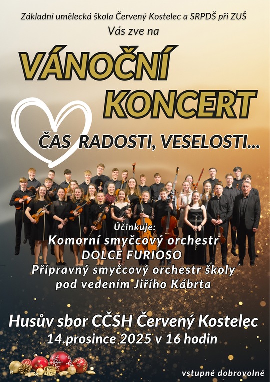 Základní umělecká škola Červený Kostelec a SRPDŠ při ZUŠ vás zvou na vánoční koncert do Husova sboru.