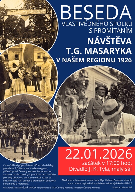 Vstupné na akci je dobrovolné. Beseda se bude konat v prostoru malého sálu Divadla J. K. Tyla, předpokládaná délka trvání cca 60 minut. Těšíme se na vaši návštěvu. Více informací naleznete na www.vlastivednyspolek.cervenokostelecko.cz.