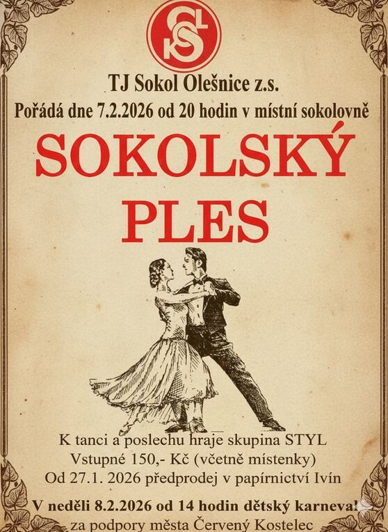 TJ Sokol Olešnice pořádá v sobotu 7. února 2026 od 20h v naší sokolovně v Olešnici sokolský ples. Hraje skupina Styl. Předprodej v papírnictví Ivín.