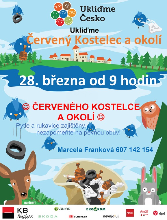 Úklidovou skupinu pro naše město opět organizuje Marcela Franková s podporou a pomocí Města Červený Kostelec a Technických služeb Č. Kostelec. Uklízet budeme centrum města a okolní části města. Pytle a rukavice zajištěny. Nezapomeňte na pevnou obuv.