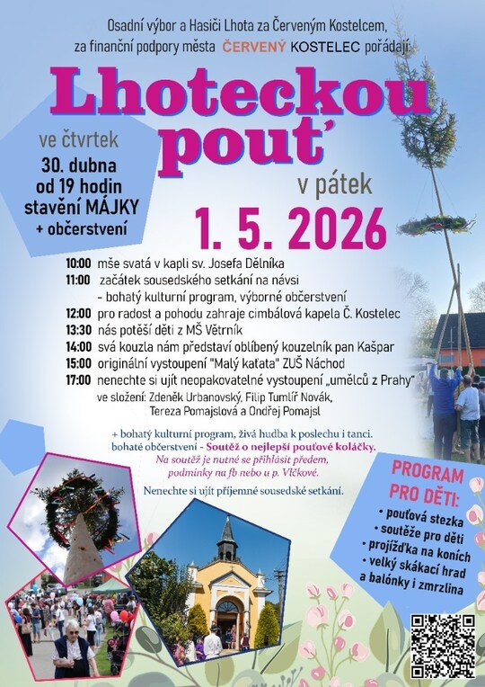 V předvečer této pouti se sejdeme 30. dubna od 19 hodin na návsi ve Lhotě, kde společně postavíme májku. Těšíme se na Vás a doufáme, že společně prožijeme příjemné chvíle.