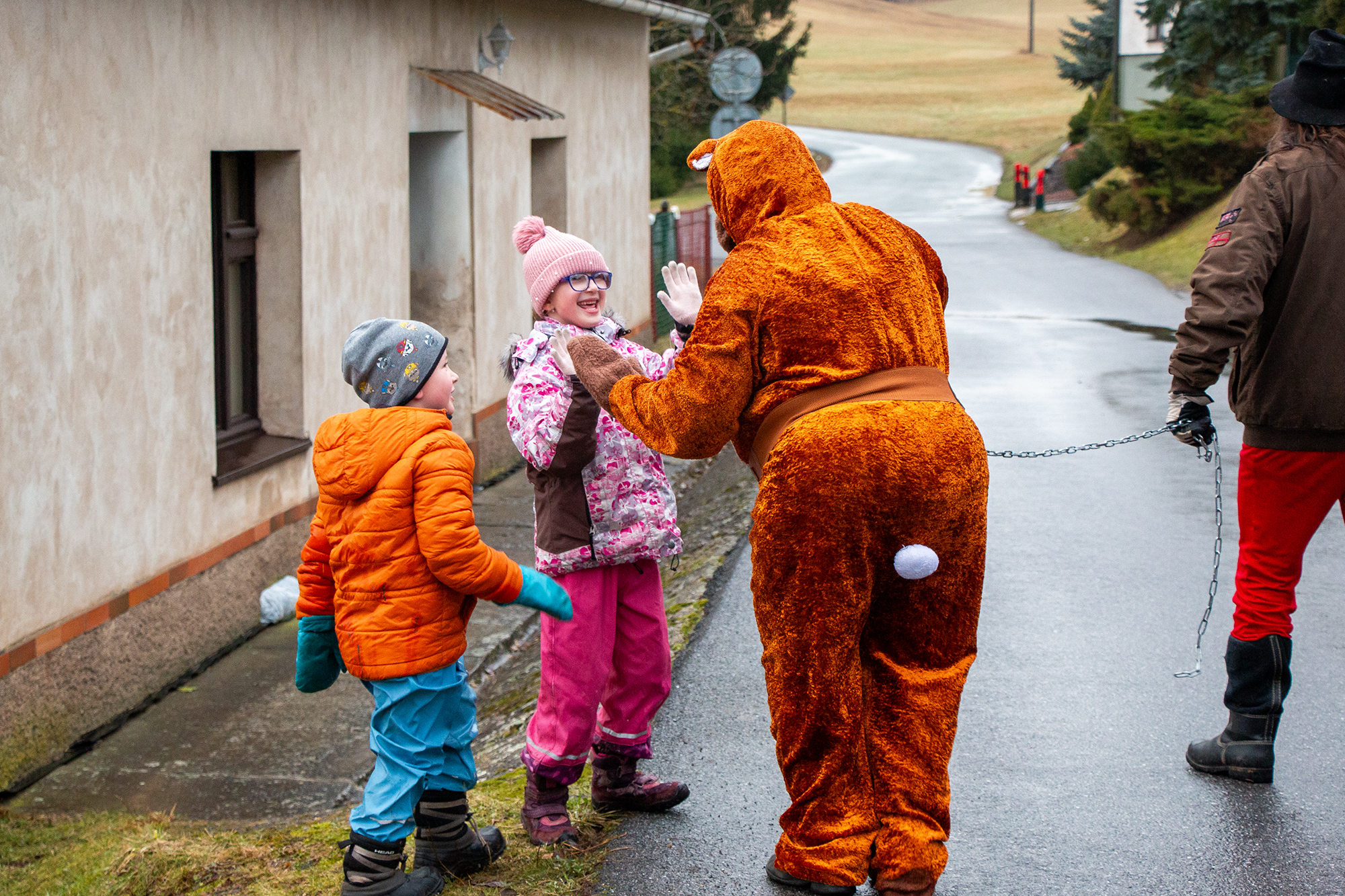 Zástup tradičních masek se v hojném doprovodu dalších účastníku v "civilu" vydal v sobotu na průvod Olešnicí. K úvodnímu tanci i k svižné chůzi vyhrávala dechovka a navzdory počasí panovala celé odpoledne veselá nálada. Neposlušný medvěd byl opět vykoupen a zubatá si ho s sebou ani letos neodnesla.