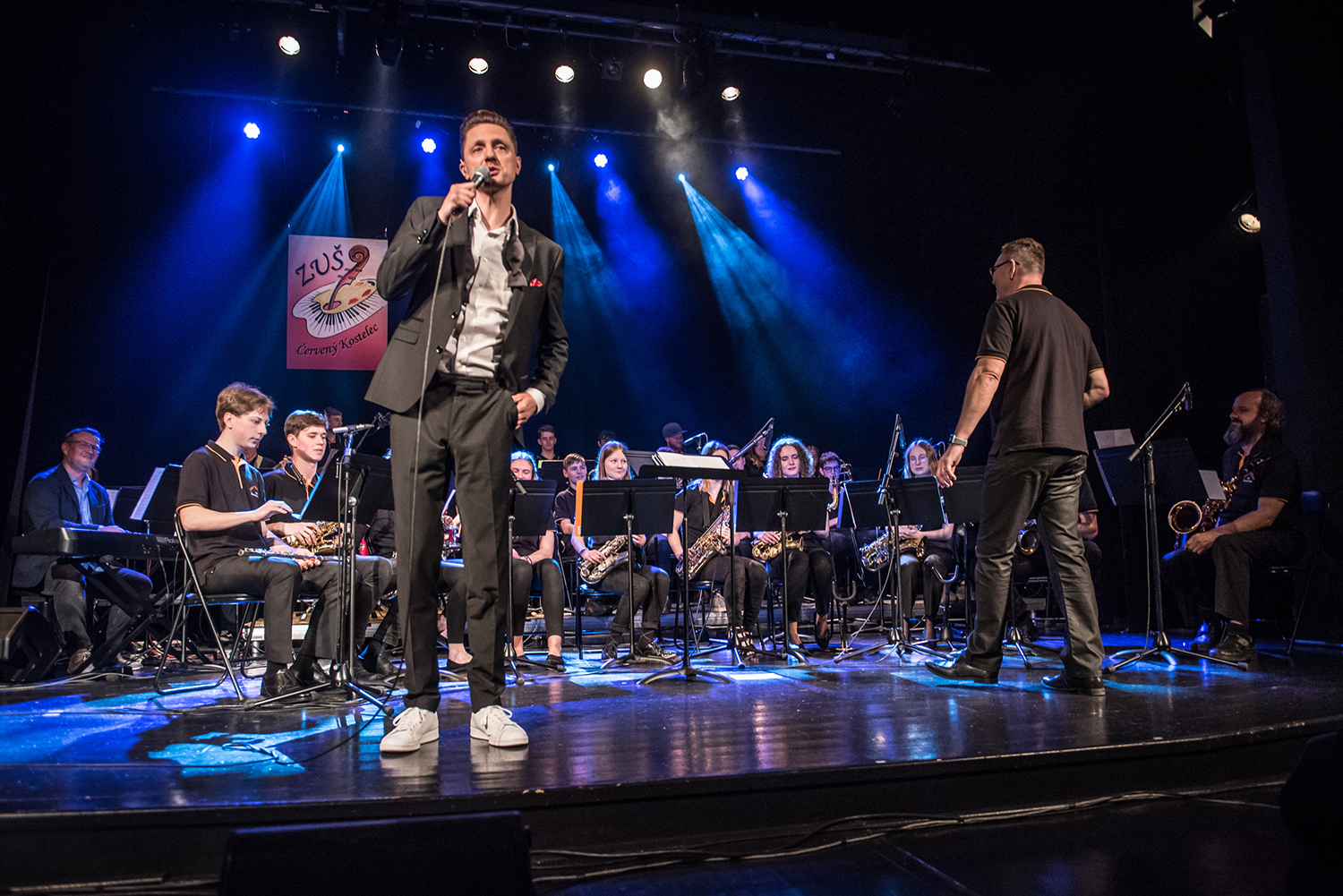 Půl roku příprav a nepřeberné množství zkoušek a soustředění se vyplatilo. A tak náš Big Band zajistil nejen důstojný doprovod k jeho bezchybnému zpěvu, ale také nový repertoár pro tak významný večer. Koncert skvěle obohatil moderací i svým muzikantským umem hradecký jazzový matador a moderátor Jirka Pavlík, který si s červenokosteleckou hudební formací zahrál také jednu ze skladeb. Přínosem kapely je i jazzový klavírista, učitel a náš kamarád Marián Linhart. Jinak bylo kompletní obsazení Big Bandu tvořeno žáky ZUŠ Červený Kostelec a vedoucími sekcí, kteří žákům pomáhají a vedou cestou správného frázování, synkop a těžkých rytmů jazzové hudby.