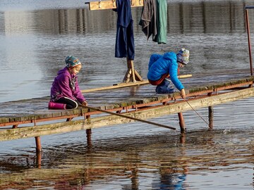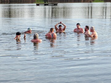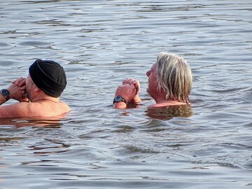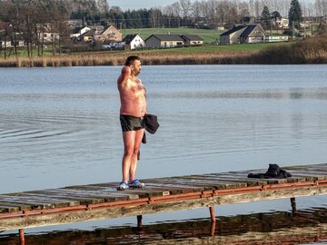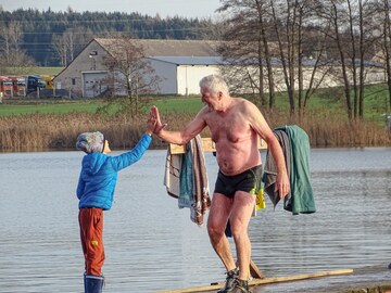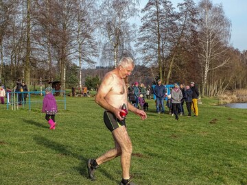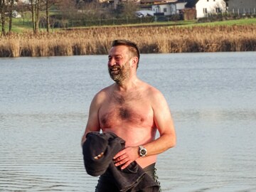 Jak by řekl klasik: „ve zdravém těle, zdravý duch“. Tímto citátem se řídila i místní partička otužilců (Kostelecké hyeny), která začala nový rok v ledové vodě rybníku „Broďák“. Foto: Jan Brož