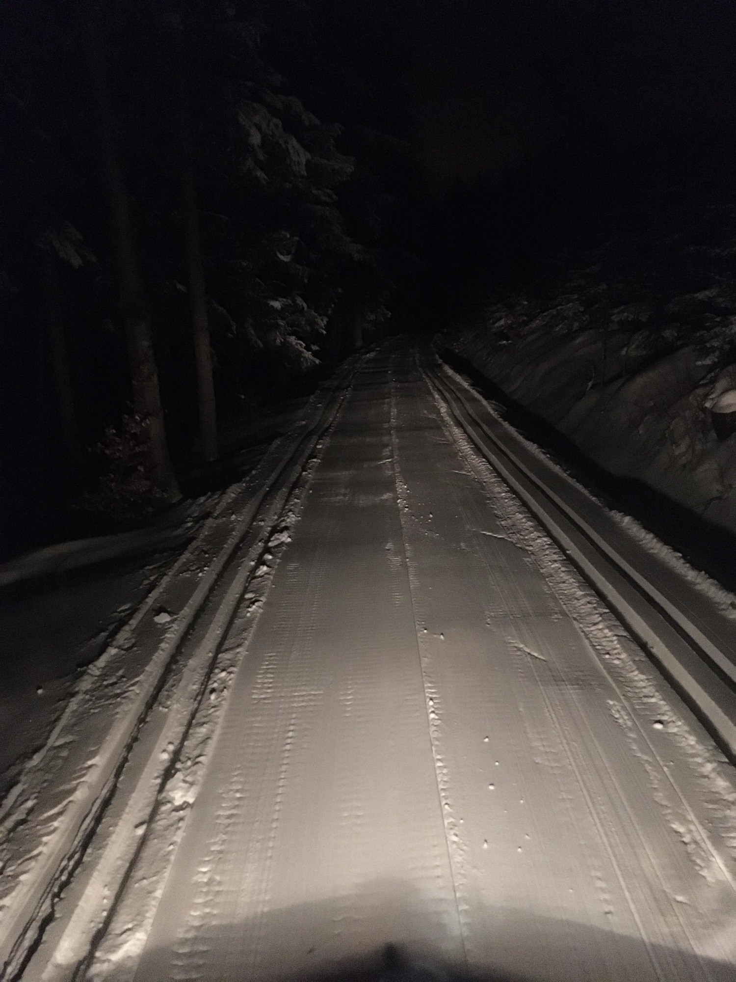 Od Bílého Kolu pouze klasika i na loukách, tam uválcujeme před víkendem. Ve středu a další dny upravíme úsek Krkavčina – Švédský vrch - Odolov a nástupní trasu z Kvíčaly na Paseky. Foto z úterního večera. Do rána nám do stopy trochu napadlo, ale je to super!