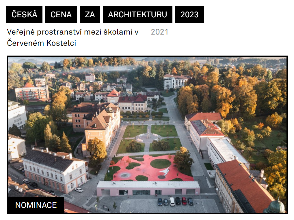 Veřejné prostranství mezi školami v Červeném Kostelci od studia 2021 bylo na slavnostním nominačním večeru 27. června nominováno na Českou cenu za architekturu. Jedná se o nejprestižnější tuzemské ocenění udělované mezinárodní porotou.