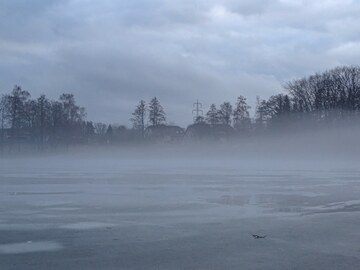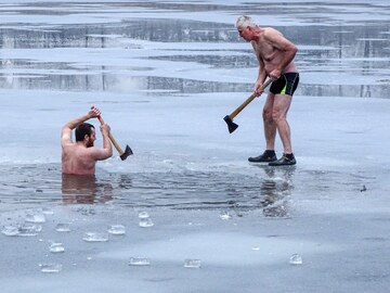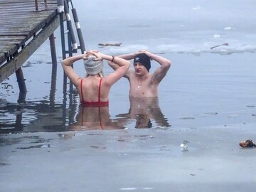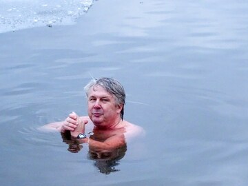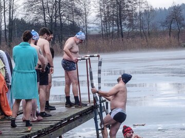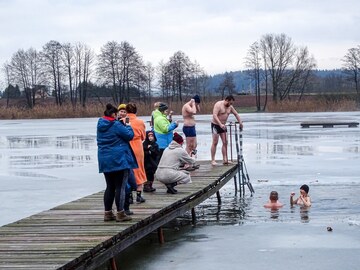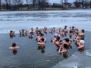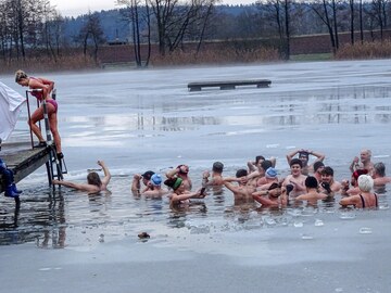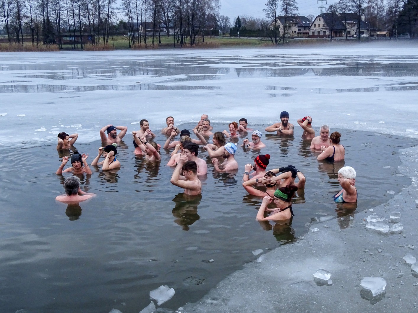 Jak by řekl klasik: „ve zdravém těle, zdravý duch“. Tímto citátem se řídila i místní partička otužilců (Kostelecké Hyeny), kteří začali nový rok v ledové vodě rybníku „Broďák“. Foto: Jan Brož